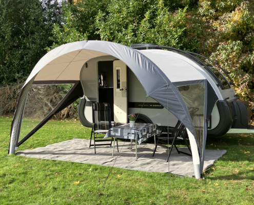 Das Vorzelt kombiniert Vorzelt und Sonnendach in einem, wobei die Wände abnehmbar sind – für maximale Flexibilität und Komfort.